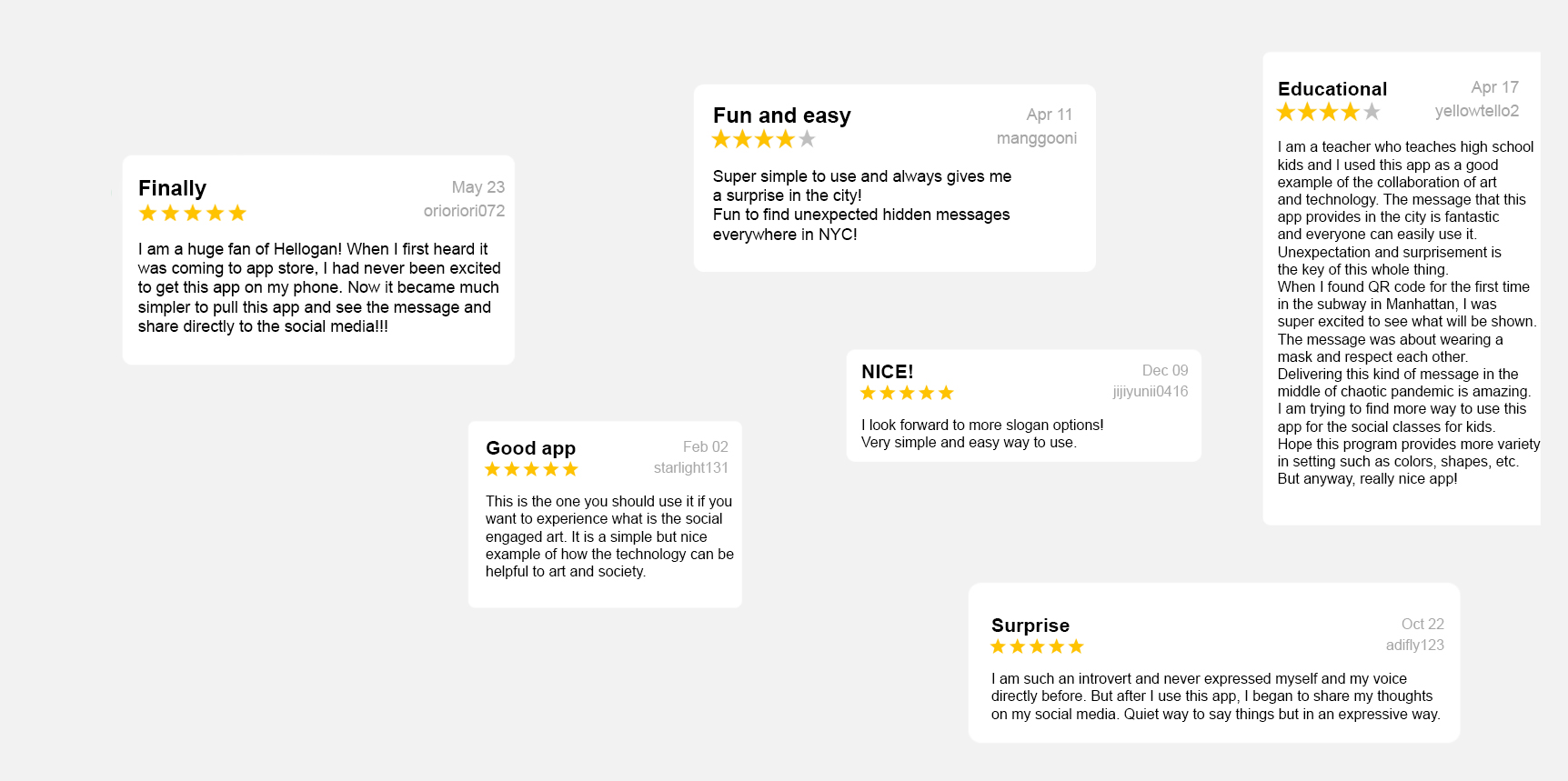 This project allows people to speak their voices anywhere and anytime without having much effort through their smart devices. When users scan the QR code, it will show the random objects that fall from the sky automatically. These objects are easily recognizable shapes, such as balloons or air bubbles. When the object hits any kind of surface, for instance, a ground, human body, and any other collision parts, it will transform into a certain word. On a falling object, the deformed word remains in its original deformed position. This Hellogan project is programmed to drop only 3 objects at a time when the user presses a button on smart devices. The combination of the three words contain meanings that refer to past or present social problems.