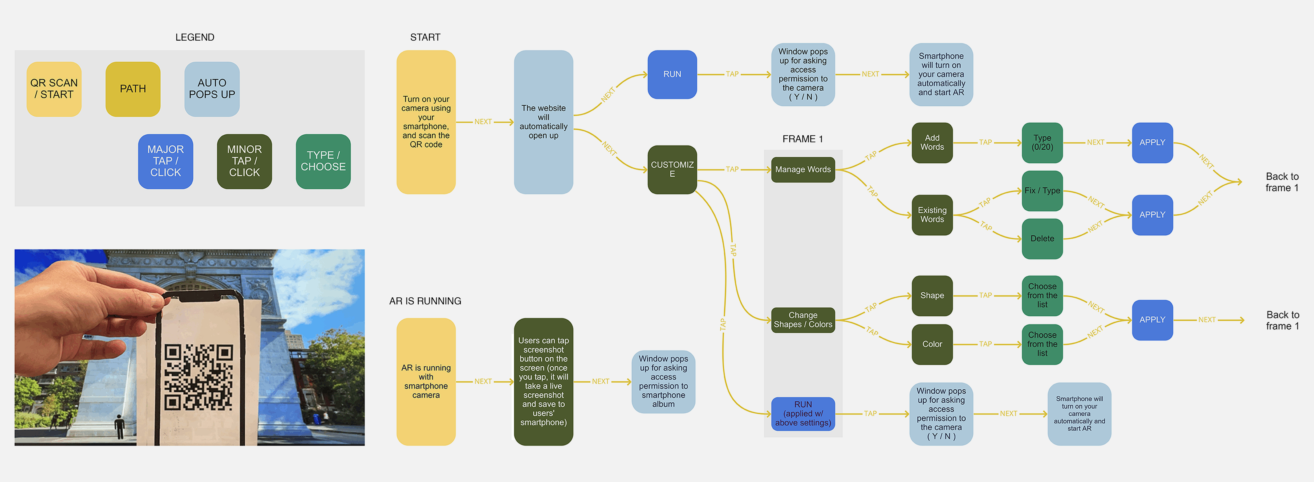 While people are playing with this AR interaction activity, users can press the button to take a picture or record video with their device. Thus, people who participated can save the memories in their devices and social media, and share with others. On the other hand, this activity can be more enjoyable when people help each other. Some people hesitate to talk or interact with others. However, through this activity, people can help each other to make this work better. I believe this small event can create a positive vibe between people.