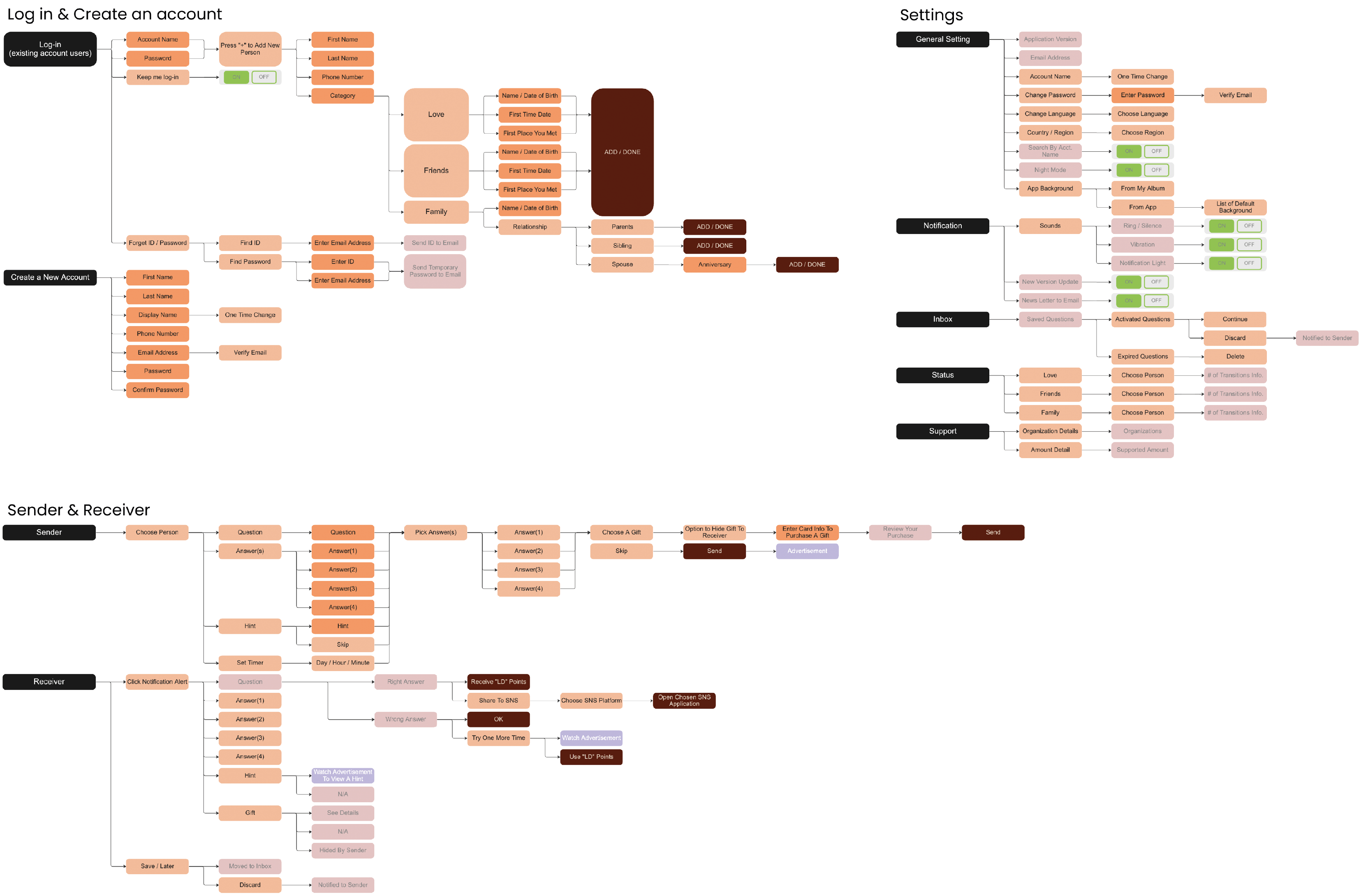 Similar to the initial prototype studies, this information architecture diagram helped me further design the layout to check usability and usable features before creating a digital prototype.