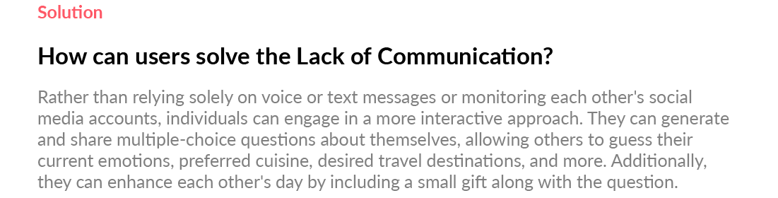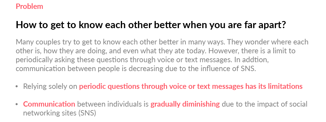 The type of questions may vary in such way of sending a joke and non-sense question or things that even impossible to answer. You can give couples a chance to loosen up naturally, or improve their relationships with friends, acquaintances, or family members who have lost contact. It is a mobile product that can be used socially and commercially, beyond the meaning of improving people’s love and relationships.