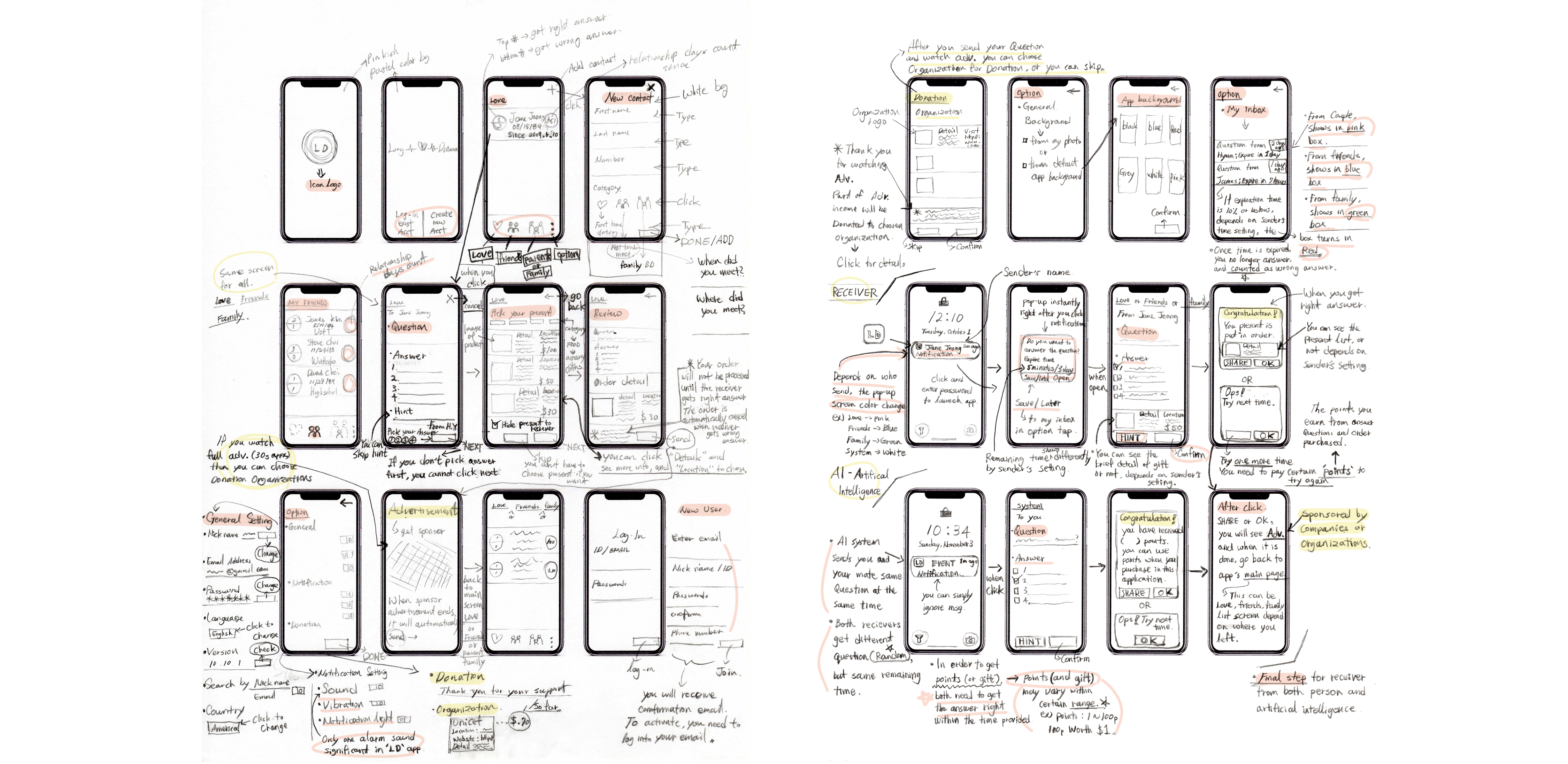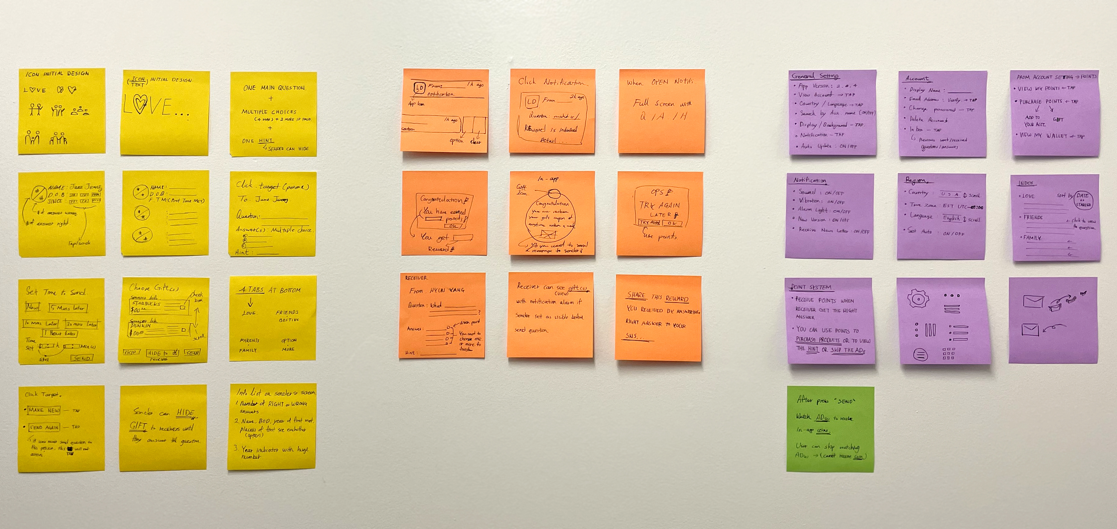 Initial idea and icon sketches on paper, and divided into 4 different sections of sender, receiver, setting, and option interfaces, and helps to build the wireframe stronger.