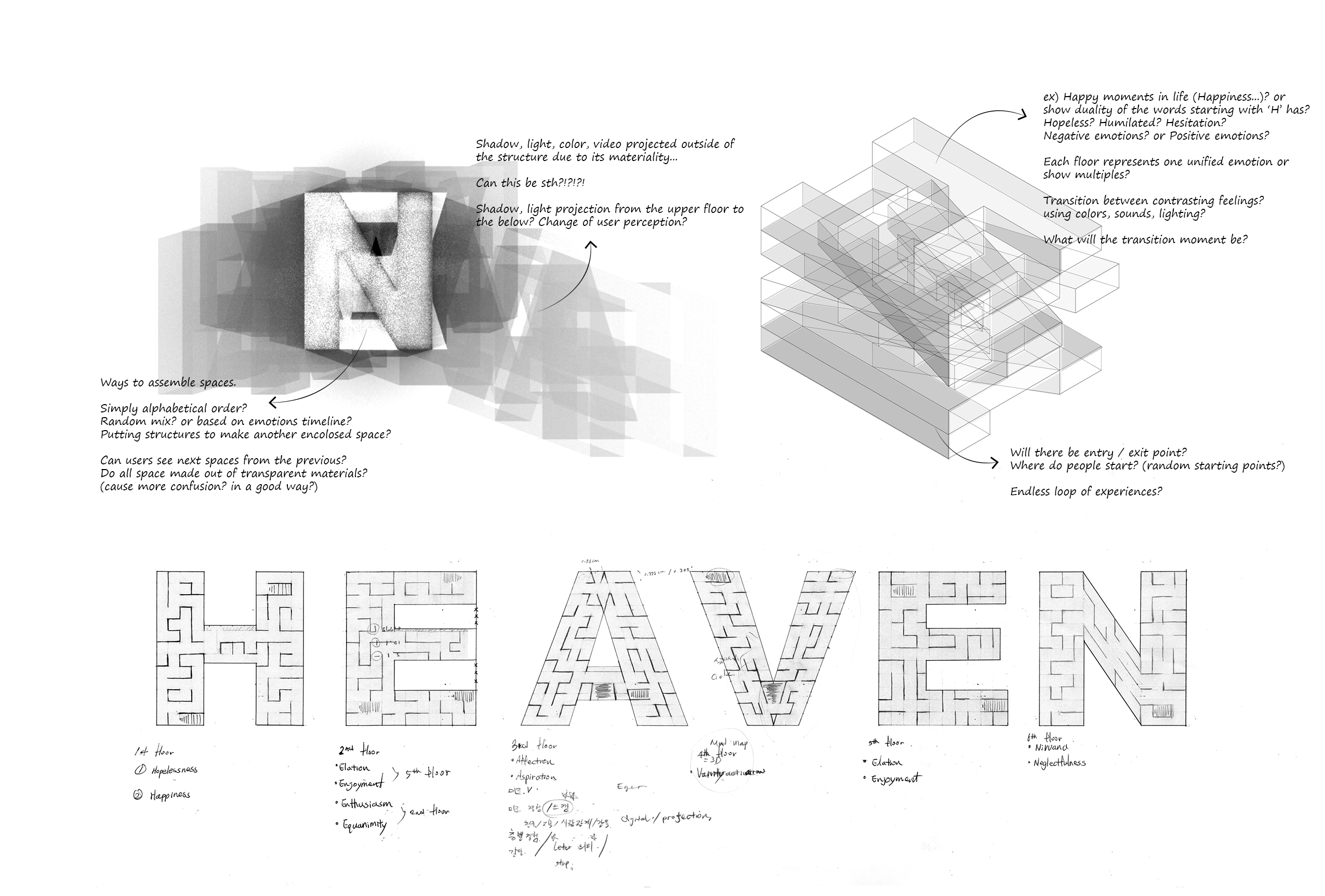 I started sketching what kind of effect can be brought when the shape of the letters, the meaning of the words, and the concept of the maze are integrated. Three interesting things I realized in this process are, first, the light that penetrates into the shapes of the letters when they are overlapped, stacked, and combined, and the shape of the shadow formed around them, and second, the sense of space formed between the overlapping and stacking of the letters. And finally, it was the atmosphere that each space had when the meaning of the letters and the meaning of the colors were combined. It was also a question of what kind of experience would be created when each different spaces interact together.